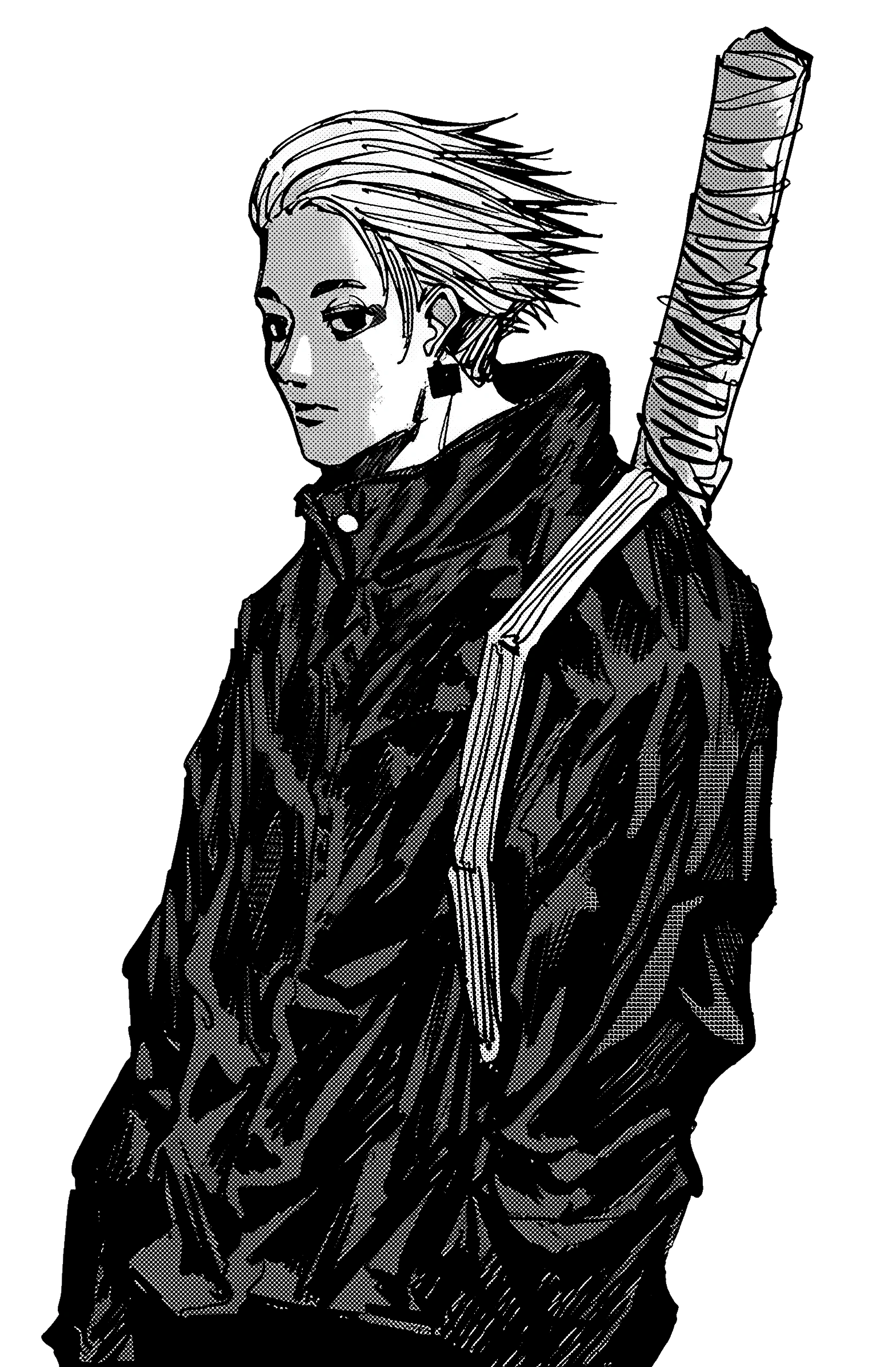 Gaku was a tall and muscular young man with spiky slicked back bluish-grey hair and hot pink eyes adorned with a red eyeliner in the outer corner. He wears a pair of black square-shaped earrings, a high-collared navy blue jacket with a yellow button that loosely falls around his body that is covered in multiple scars with the sleeves rolled up, bandaged hands, navy blue baggy pants and white sneakers with light grey stripes and a black lace (the sneakers are fully white in the manga). He always carries his weapon wrapped in bandanges over a bag in its right arm.