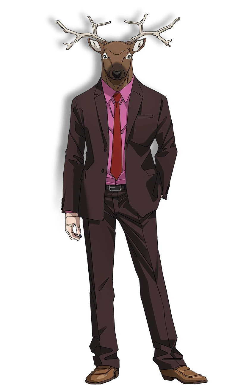 Kashima is a tall man that wears a pink polo shirt under a magenta business suit (black in the digital-colored manga) a burgundy floral-patterned tie (the tie doesn´t have flowers in the anime while in the digital-colored manga, the tie is black with red and green flowers), black belt with a silver fivel (he doesn´t have a belt in the manga), brown shoes (black in the manga) and the mask of a realistic reindeer head with a dark brown snout and cream-colored spots in the ears and under his eyes (the spots didn´t exist in the manga). Without his mask, he has sunken black eyes, sharp eyebrows, slicked back lilac hair with dark purple streaks (white in the digital colored manga) and dark blue fingernails (black in the digital-colored manga). He has an X-shaped stitch over his mouth that clearly showing his admiration for Slur.