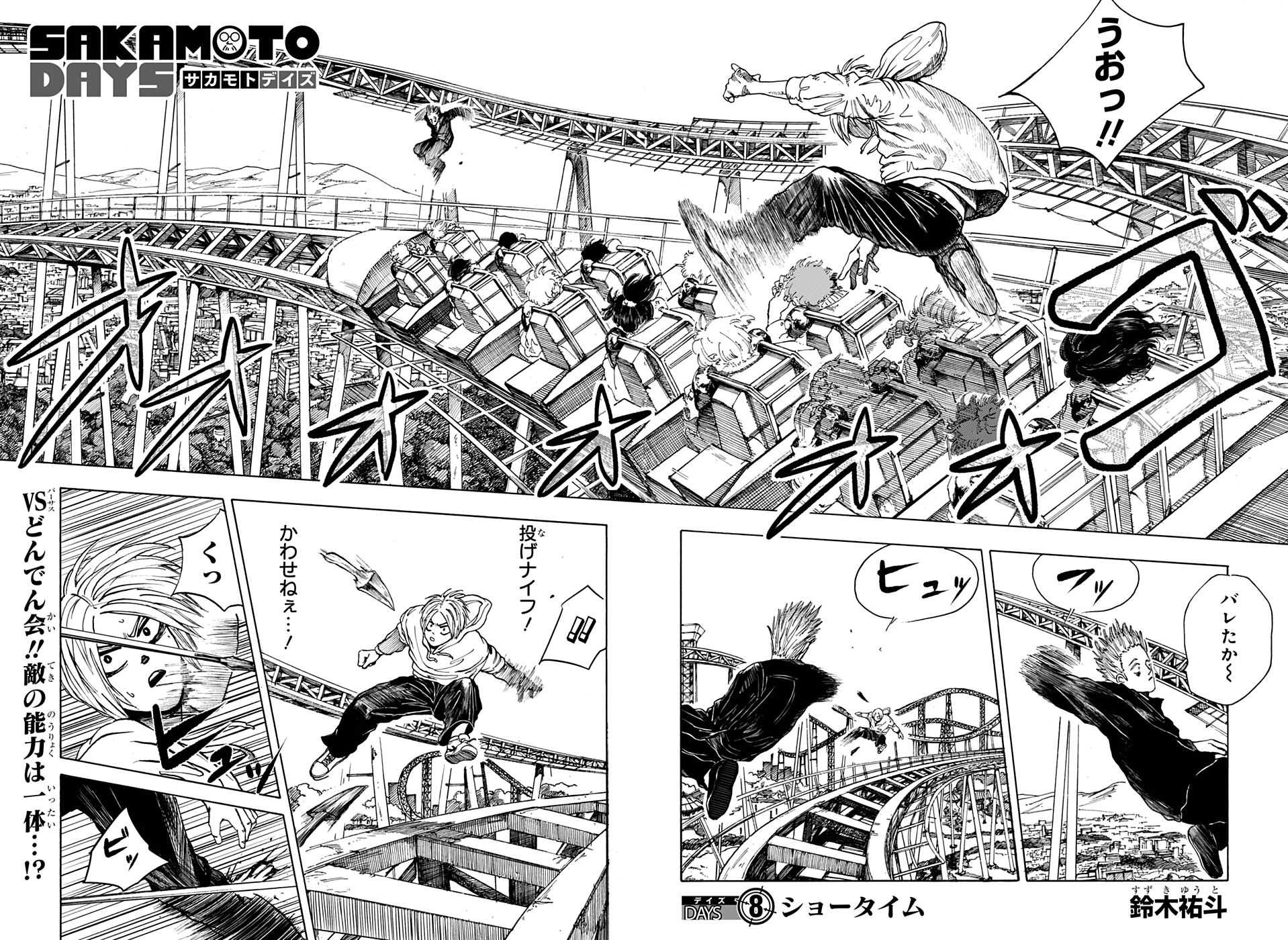 The Sakamotos were in the amusement park. Shin and Lu Shaotang also came to the amusement park with the Sakamotos in order to protect them, so that they could have a wonderful day without interruption. Shin detected an assassin closing in and informed Sakamoto. The assassin, Kurii Ningu, thought Sakamoto was oblivious of him and attacked him. Although Sakamoto wasn't facing him directly, he pulled out a pen from the Kurii's pocket and injected it straight into his chest. Kurii passed out shortly after. Tatsu, after mocking Kurii and checking him, doubted Sakamoto's identity as a former legendary assassin. He was somewhat bothered by Shin's power but curious about what would happen if he didn't have anything on his mind. Tatsu then decided to have a little test. He walked pass Shin and Lu and followed them all the way to the roller coaster.